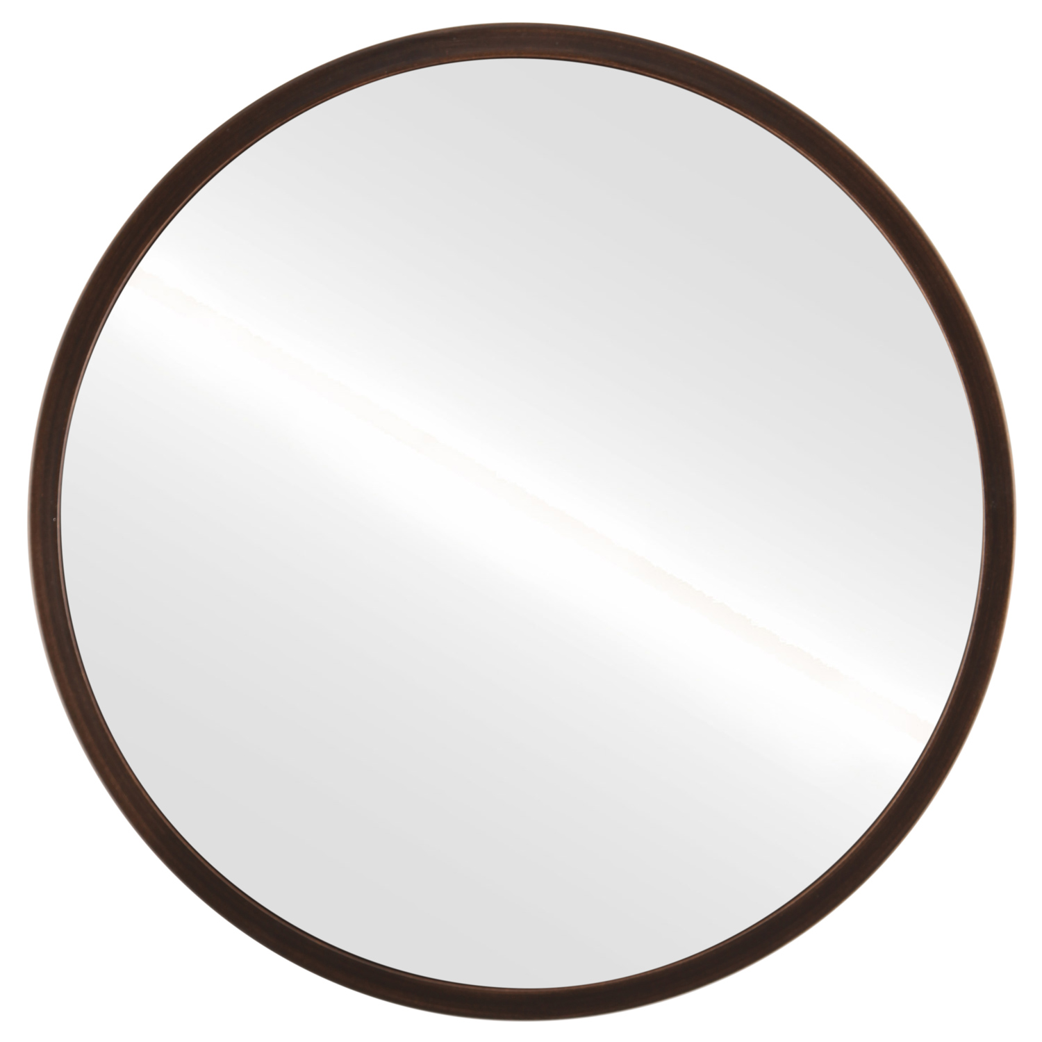 Our London round floater frame in matte black will always be trending. The slim, ½” frame with a rubbed Bronze finish provides a modern, sophisticated look. The round mirror is mounted to the frame from the front giving the mirror the appearance of it floating inside the frame. With an additional to the modern look, this mounting technique gives a three-dimensional appearance in the overall look.